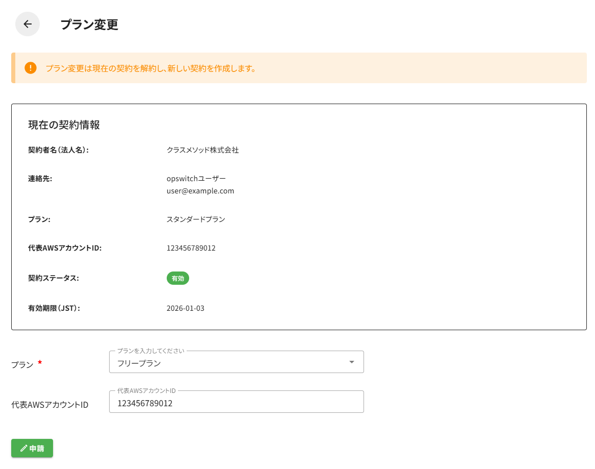 プラン変更は現在の契約を解約し、新しい契約を作成します。