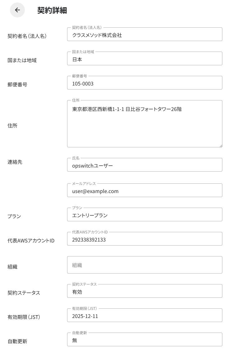 契約詳細画面では、契約の全ての登録情報を確認できます。契約者名、住所、連絡先、プラン、代表AWSアカウントID、組織、契約ステータス、有効期限、自動更新などの情報が表示されます。この画面では閲覧のみ可能で、編集はできません。