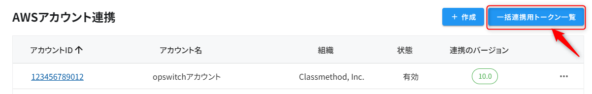 - AWSアカウント連携ページ右上の「一括連携用トークン一覧」をクリックします。オーナー権限をもつ組織に所属していない場合はクリックできません。