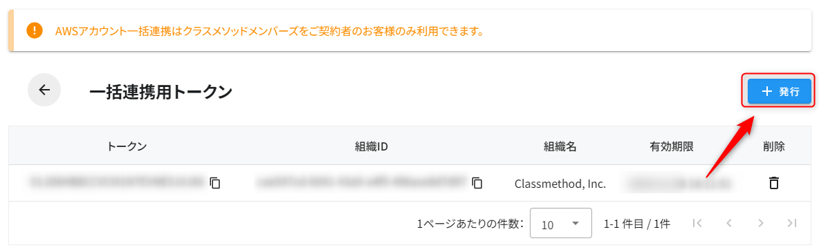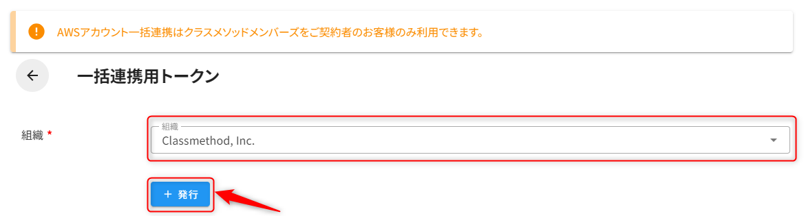 - 一括連携用トークン一覧ページ右上の「発行」ボタンをクリックします。クラスメソッドメンバーズポータルに登録済みのメールアドレスと一致しないユーザーの場合は発行ボタンをクリックできません。