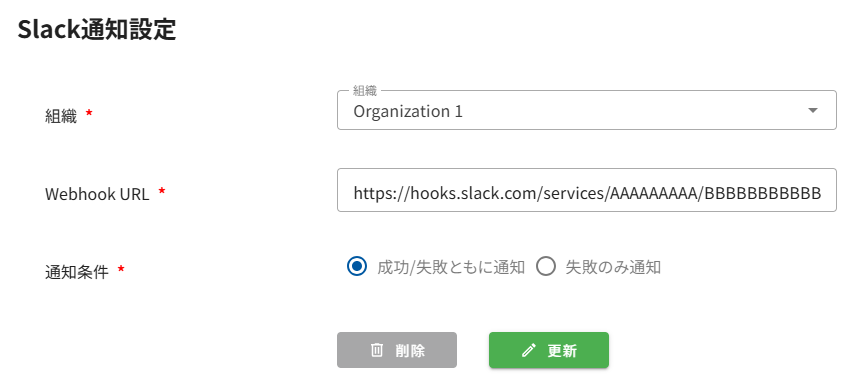 Section titled “Webhook URL”SlackアプリとWebhook URLの作成方法はこちらをご覧ください。